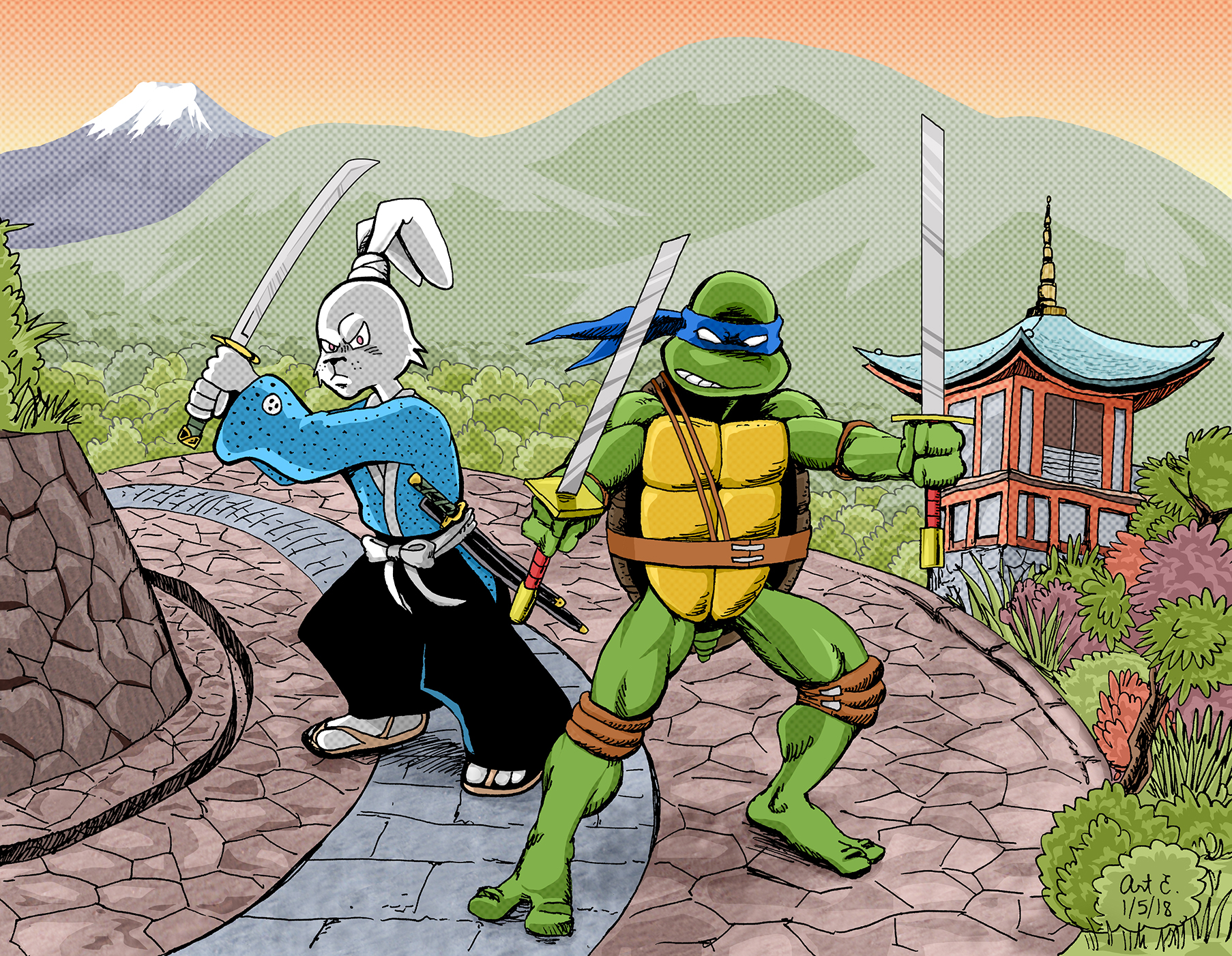 In anticipation of my summer trip to Japan, I drew a couple of my favorite characters from my youth together, which I would easily relate with Japan: Leonardo, the sword bearing ninja turtle, and Usagi Yojimbo, the ronin samurai. I drew them in a Japanese setting.