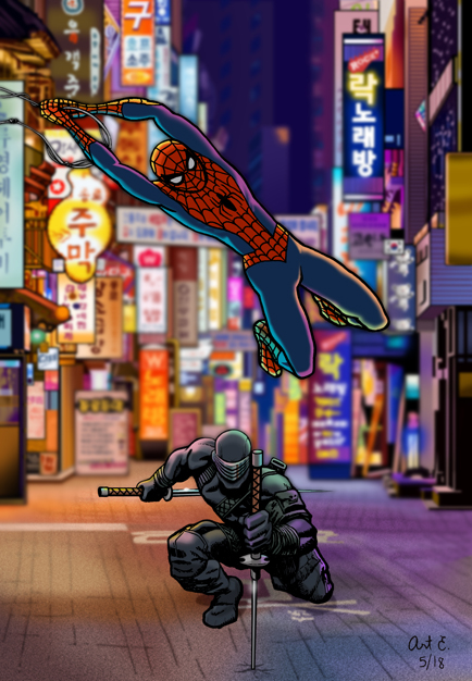 In anticipation of my summer trip to South Korea, I drew a couple of my favorite characters from my youth, that I decided to place on a street in the lively city of Seoul. I chose Spider-man and Snake-Eyes because as a 12 year old, I would draw the two of them in comic adventures (called S&S) teaming up, and taking on bad guys. This digital painting is a call back to my inner child, while looking forward to my trip to the South Korean capital.